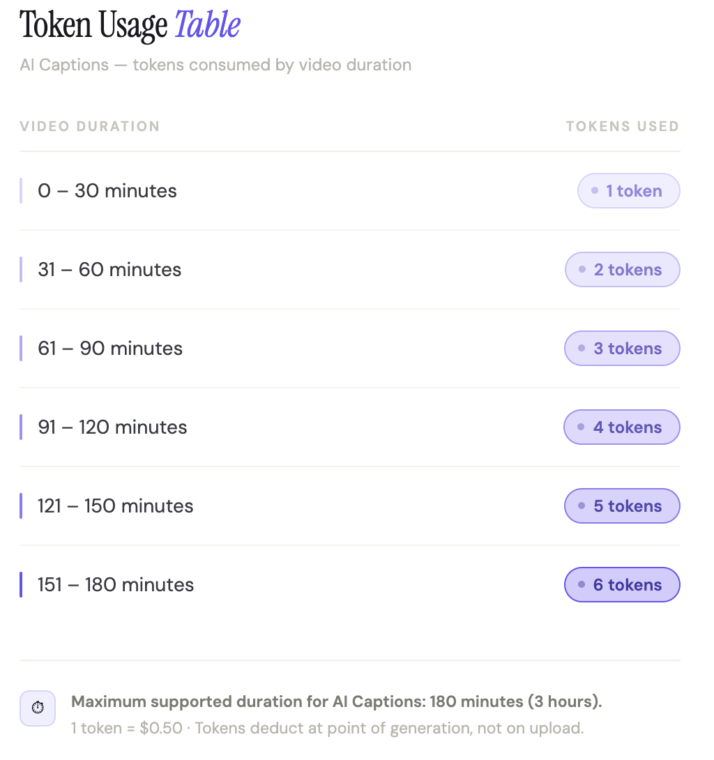 This structure keeps things simple, avoiding confusing per-minute billing and giving users a clear expectation of token usage before generating captions.